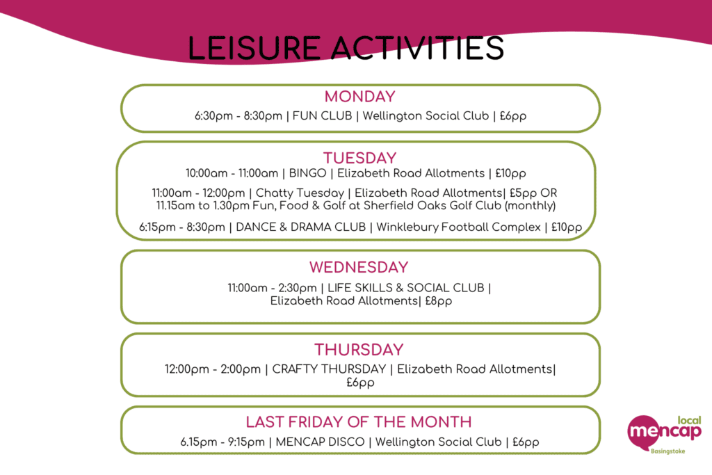 Take a look at our regular leisure activities! From Crafty Thursdays and Chatty Tuesdays to our popular monthly Disco, there’s something for everyone. Check out the timetable for days, times, and venues, and get in touch with Debbie, our Leisure Services Manager debbie@basingstokemencap.org.uk or 07895 376133.